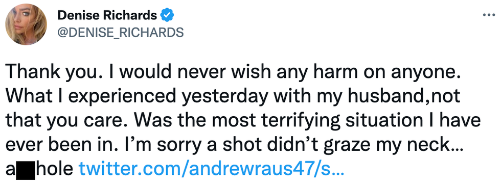 On Monday, Real Housewives of Beverly Hills star Denise Richards and her husband Aaron Phypers were involved in a terrifying road rage incident in which the couple's car was hit by a bullet.