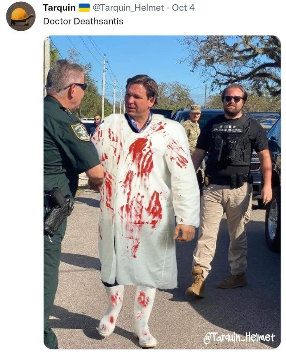 \u201cAfter receiving public backlash for wearing white 'go-go boots' during a tour or Hurricane Ian damage, Ron DeSantis shows up in footwear more appropriate for the Republican Governor of Florida.\u201d— PaulLeeDicks (@PaulLeeDicks) 1665076902