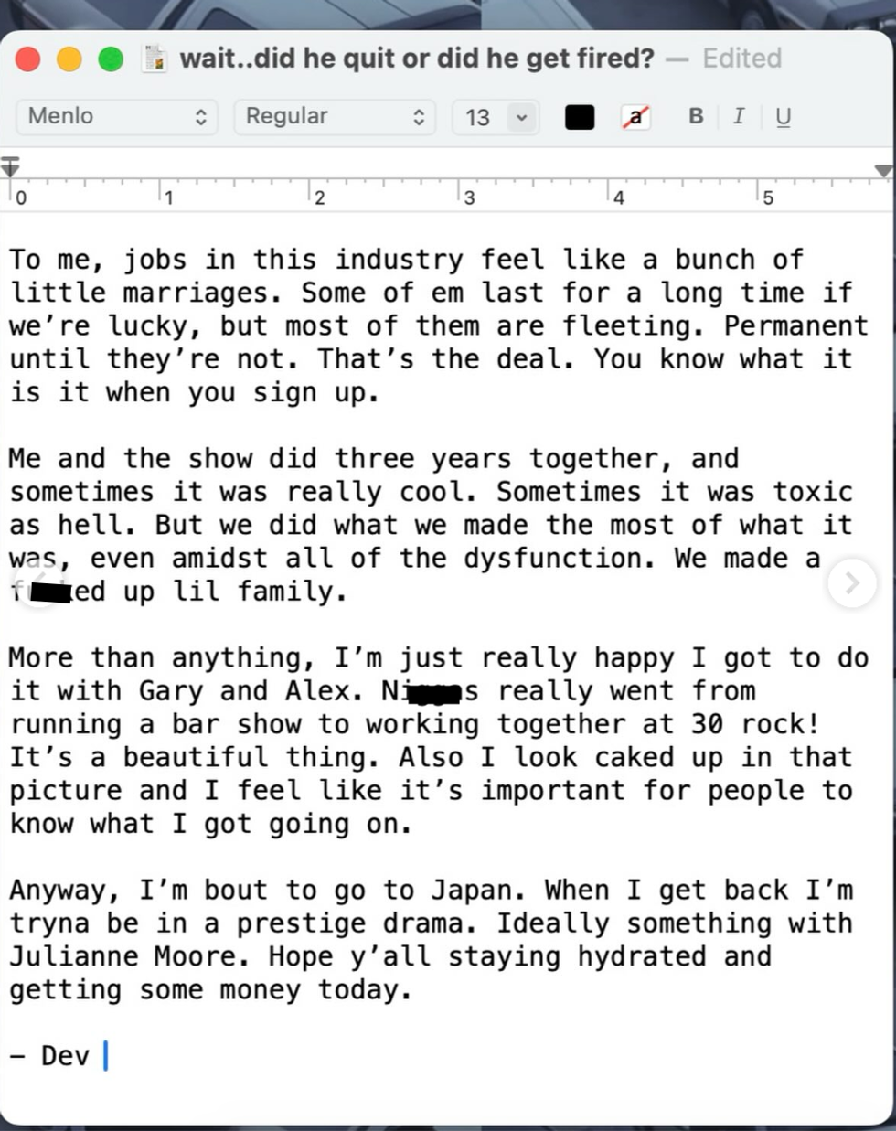 Though the caption was short and sweet, he further elaborated in a note later in the post. Despite labeling the note as "wait...did he quit or did he get fired?" he actually did not answer that question.