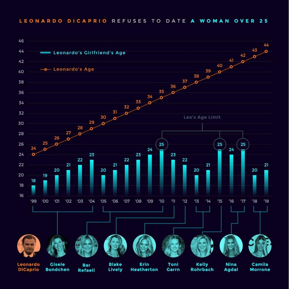 Some brilliant folks over at Reddit actually compiled the data three whole years ago—on the "dataisbeautiful" subReddit, of course. And well, let's just say it's no joke DiCaprio really seems to have a firm expiration date for his partners.