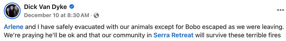 On December 10, Dick Van Dyke shared on social media that he and his wife Arlene Silver were forced to evacuate their home in Malibu due to raging wildfires.