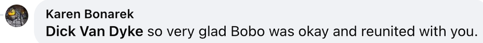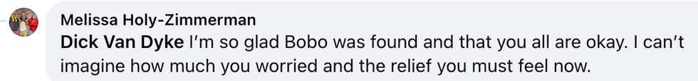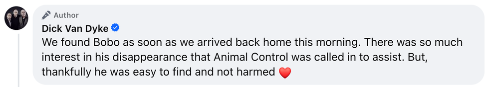 Given the magnitude of support from fans and magic of social media, Van Dyke reported the next day that animal control had gotten involved and Bobo was found safe and sound, commenting on his first post: