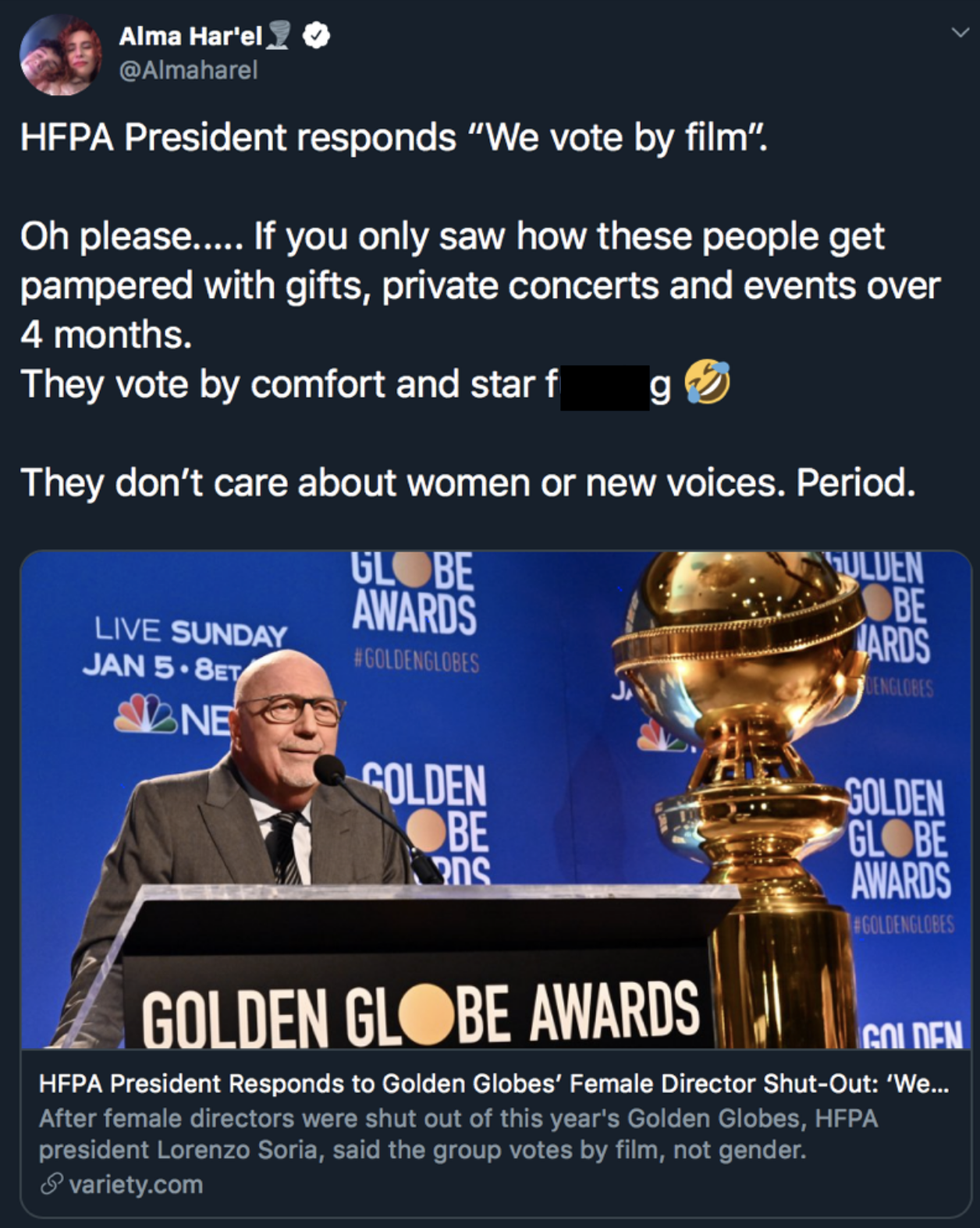 On social media, Honey Boy director Alma Har'el – whom many film-goers and critics alike expected to earn a nomination – called out her disappointment, tweeting: