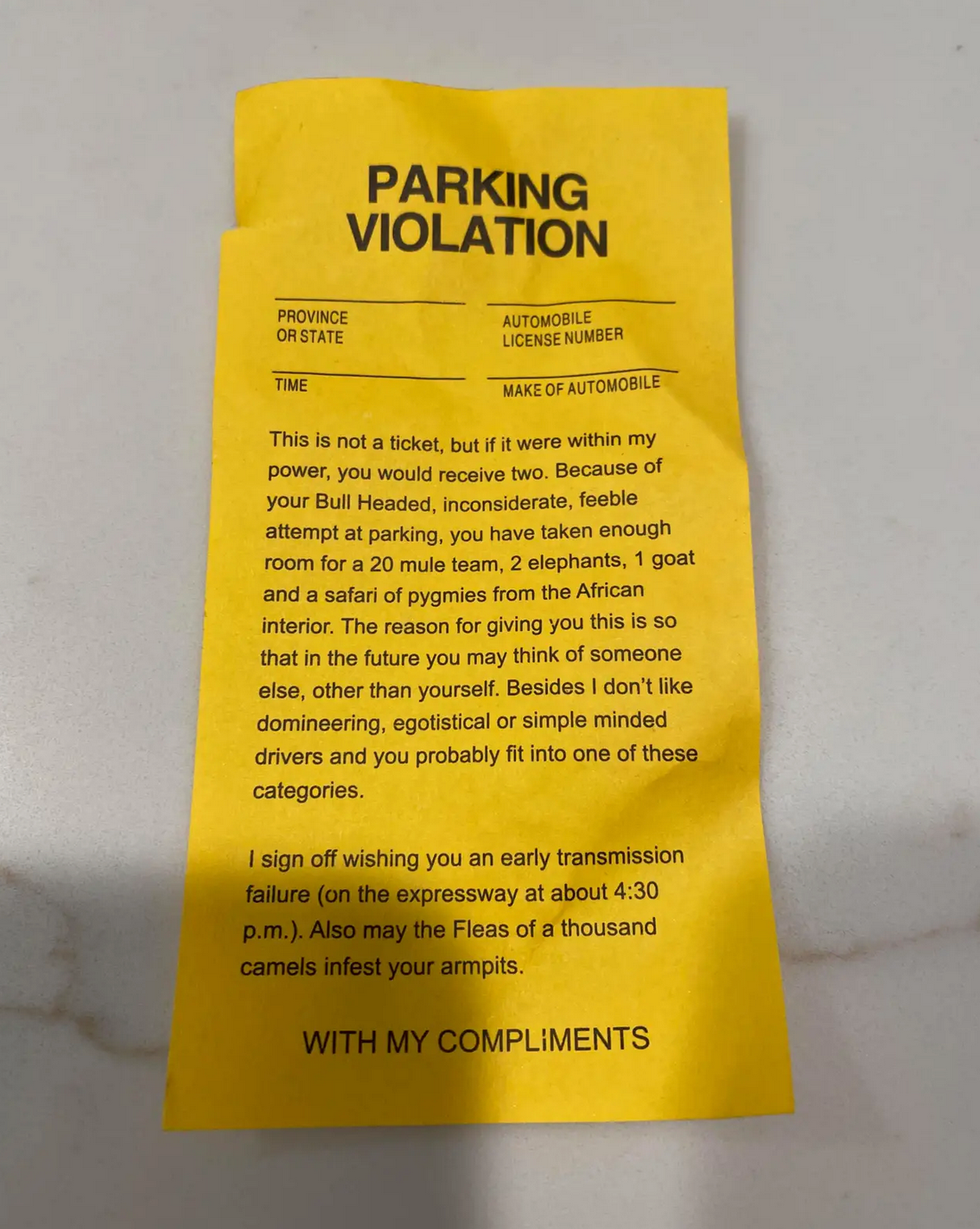 "Because of your Bull Headed, inconsiderate, feeble attempt at parking, you have taken enough room for a 20 mule team, 2 elephants, 1 goat, and a safari of pygmies from the African interior."