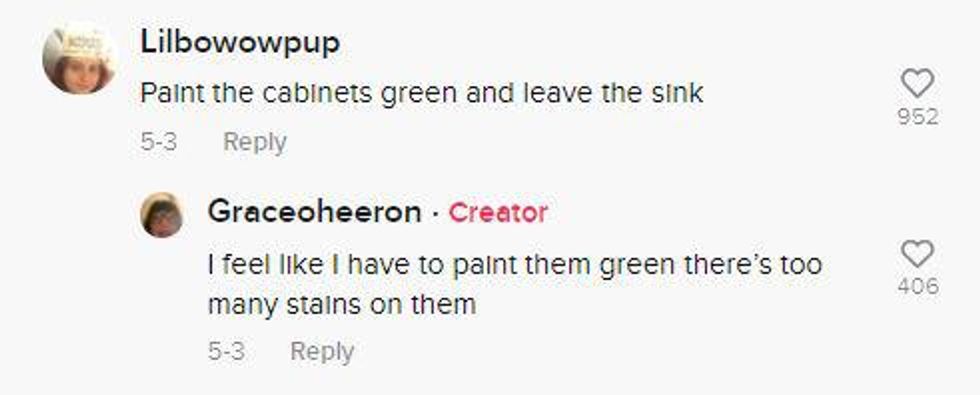 Eventually, she did get the rest of the paint off of her counter and started painting the cabinets green.