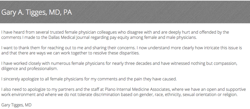 "I also need to apologize to my partners and the staff at Plano Internal Medicine Associates, where we have an open and supportive work environment and where we do not tolerate discrimination based on gender, race, ethnicity, sexual orientation or religion. Gary Tigges, MD"