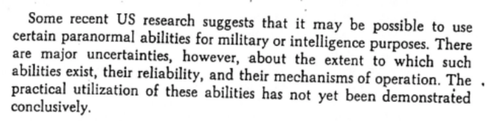 "Some recent US research suggests that it may be possible to use certain paranormal abilities for military or intelligence purposes.
