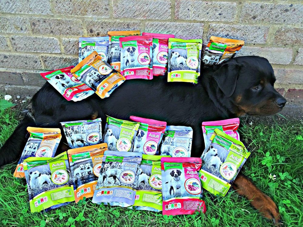 A dog lover who is obsessed with her rescue Rottweiler opened up about how she regularly indulges him with treats from the $26,600 stash of freebies she has won by entering 100 competitions a day.