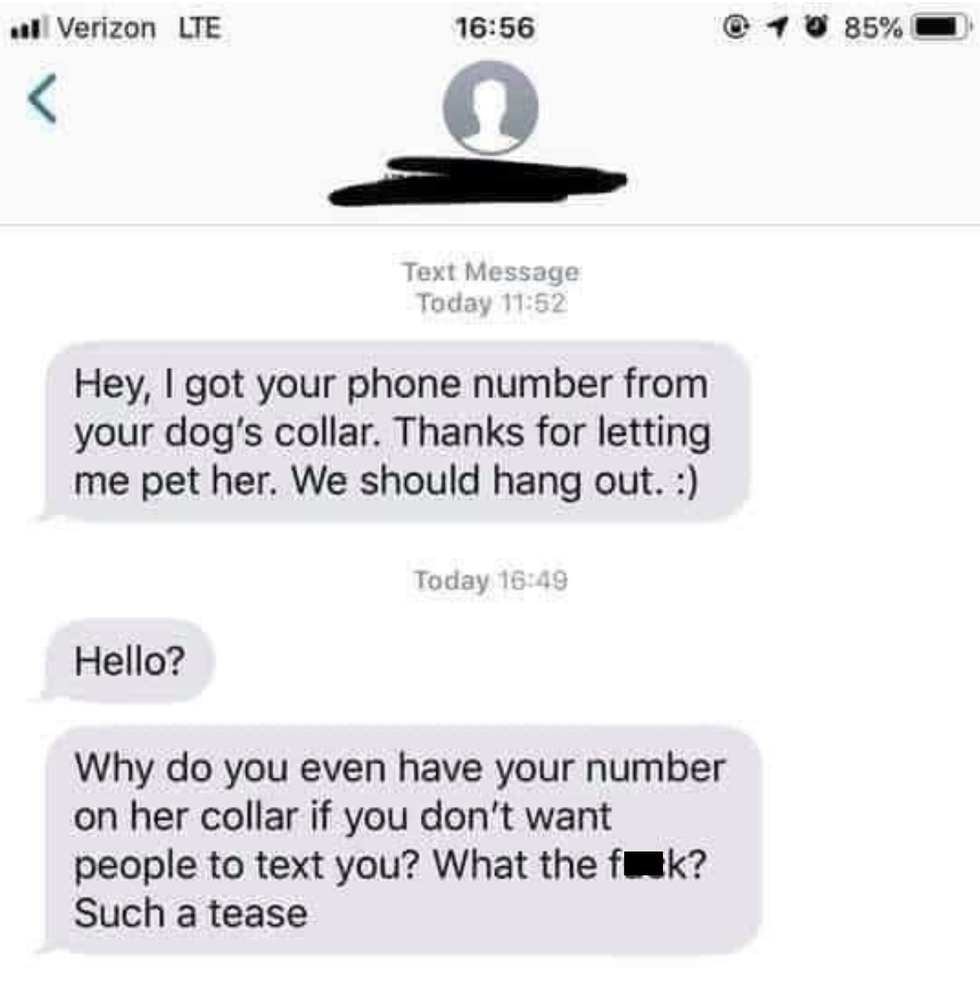 "Why do you even have your number on her collar if you don't want people to text you?"