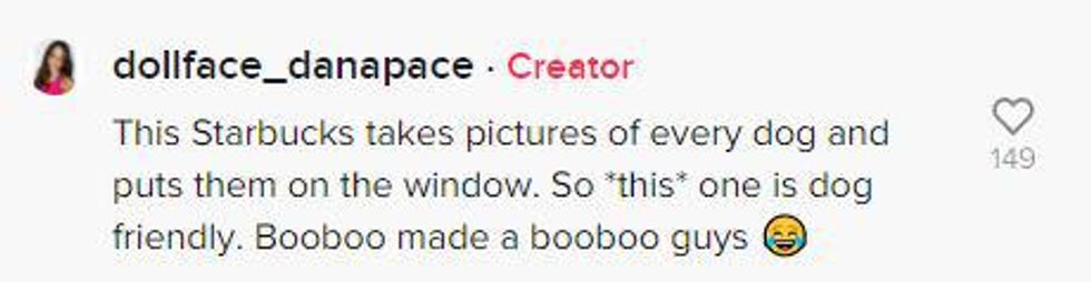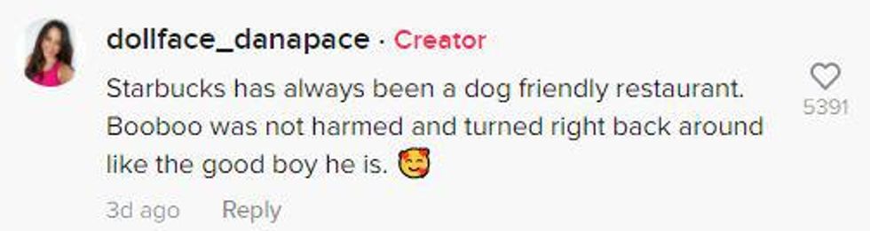 A 13 second clip showed a black dog going from the owner's car window to the person at the Starbucks drive-thru. There's sounds of @dollface_danapace laughing in the background and others shouting from the car ahead.