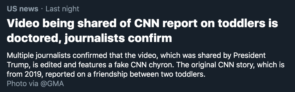 Trump's video claiming there's too much “fake news" going around was flagged by Twitter as “manipulated media" I'm DEAD bro pic.twitter.com/0UlUMqbzZD