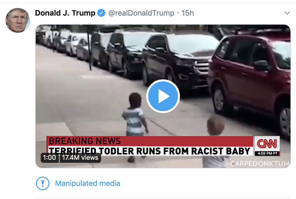 The President was mocking the so-called "fake news media" outlet CNN's coverage. Using footage that shows a Black toddler running in front of a White baby, the (misspelled) chyron in the video reads: