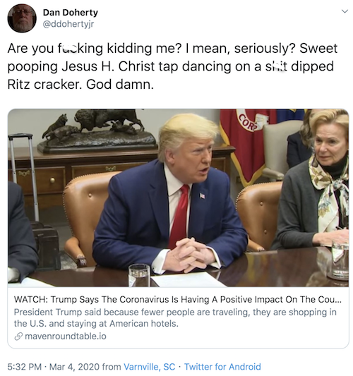 "Trump says there's a 'positive impact' to the worldwide coronavirus outbreak because people are 'staying in our country' and are 'shopping and using our hotels in this country'."