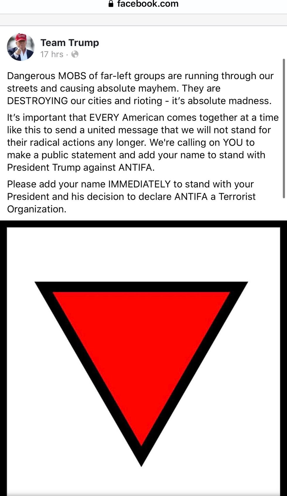 Less than 24 hrs after it went up, Trump's campaign has already pulled the anti-antifa Facebook ad with the red triangle.