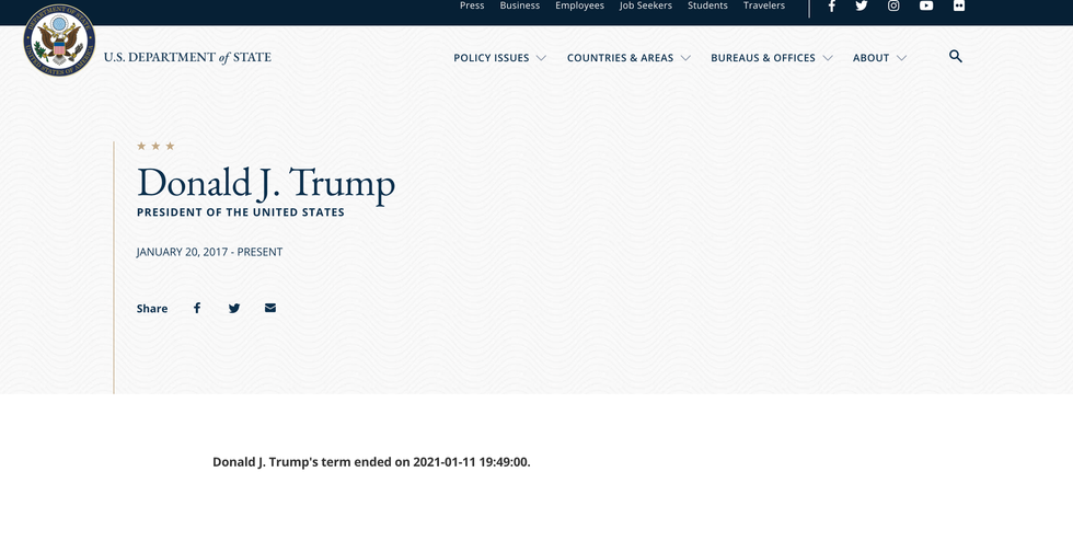 Hopes that Trump would be out of office sooner than January 20th—when President-elect Joe Biden is inaugurated—skyrocketed after Trump's biography on the official State Department website said his term "ended" on the evening of January 11th.