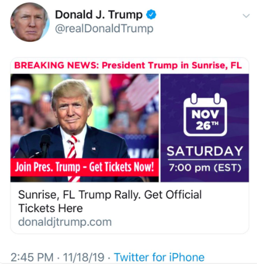On Monday, November 18, President Trump tweeted out a link to sign up for an upcoming rally in Sunrise, Florida.