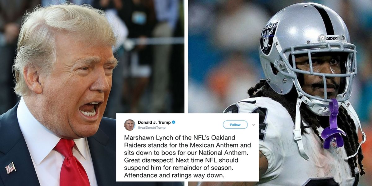 Since the beginning of the professional football season, President Donald Trump has been intensely engaged in the politics unfolding within the sport. He has repeatedly called for the firing of players who kneel, or at least do not stand, during the national anthem - extolling these players as disrespectful to both the American flag and our soldiers. So when photographs revealed Oakland Raiders running back Marshawn Lynch standing during the Mexican national anthem, but sitting during the U.S. national anthem, at a Sunday game in Mexico City (versus the New England Patriots), Trump was quick to criticize on Twitter. The president went so far as to demand Lynch be suspended for his "great disrespect."