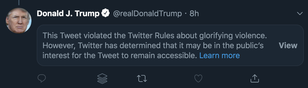 Twitter pointed out that Trump's tweet was glorifying violence, and soon flagged it with this message.
