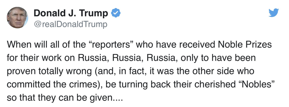 In a now deleted tweet the President lamented that the journalists who covered the President's questionable dealings in Russia received "Noble" prizes, despite being "proven totally wrong."