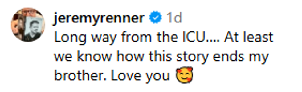 But the point of the post is what Downey Jr. is looking at while flexing, which is his hardback copy of Jeremy Renner's memoir, My Next Breath, which tells the story of his near-fatal snow plow accident.