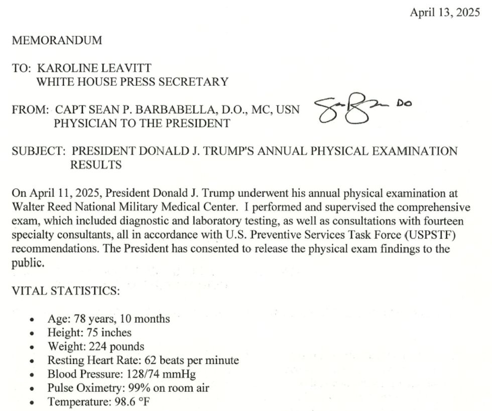 A memorandum addressed to White House Press Secretary Karoline Leavitt and signed by Captain Sean P. Barbabella—doctor of Osteopathic Medicine (D.O.), Medical Corps (MC), United States Navy (USN), physician to the President—was shared on the White House website.