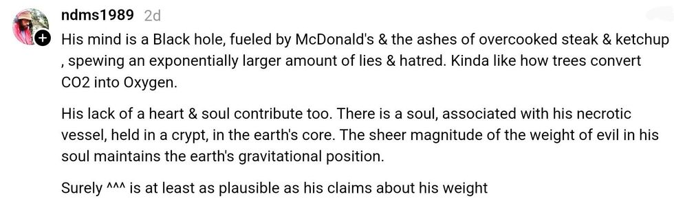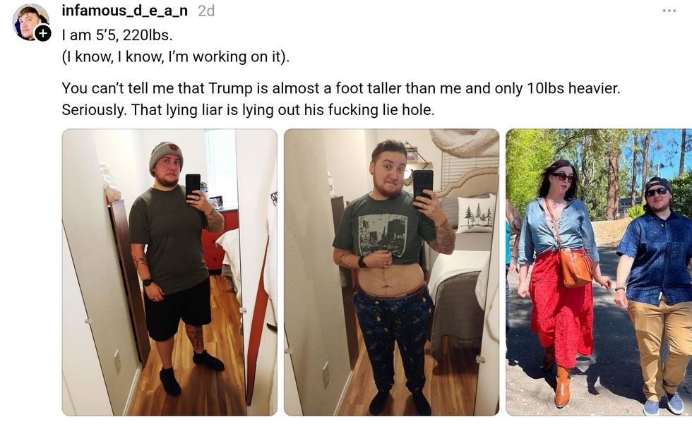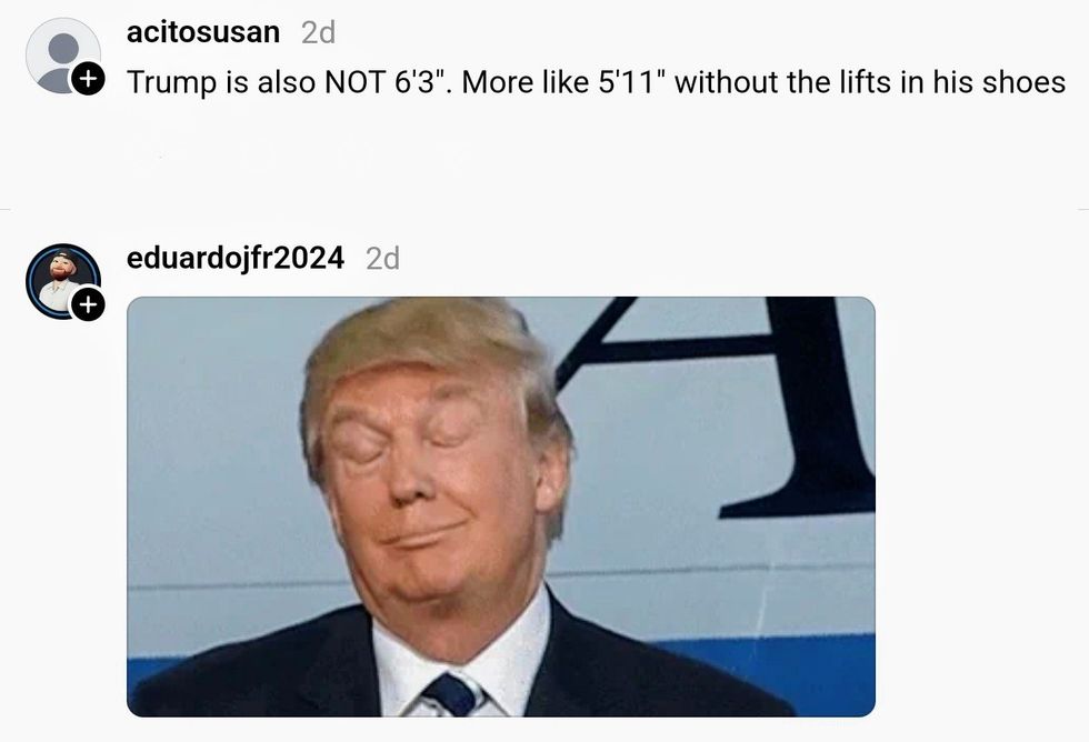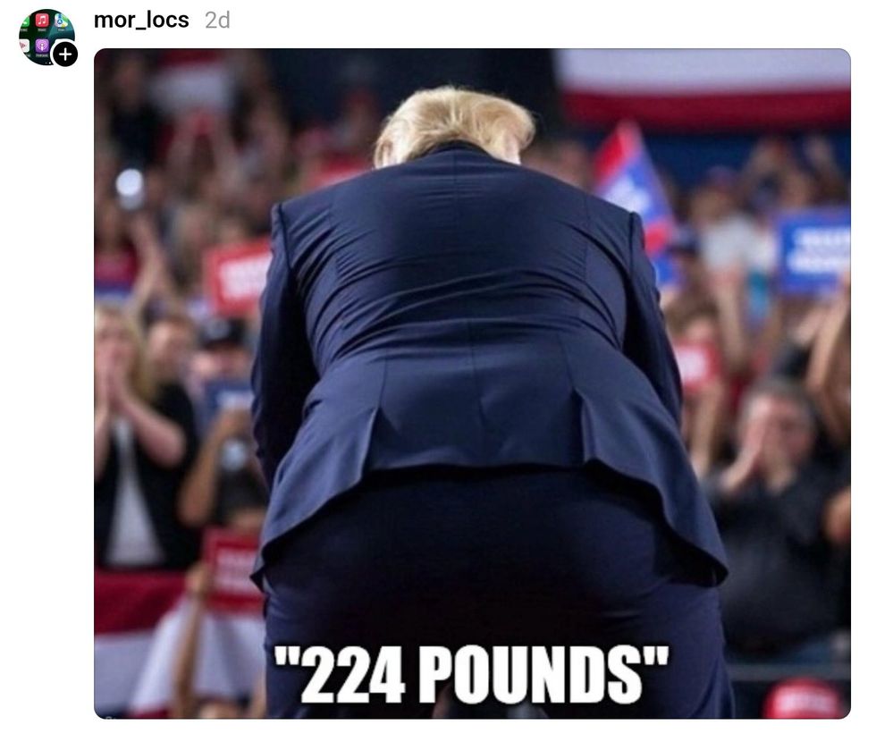 With each Trump physical, people have had the most difficulty buying the accuracy of Trump's reported stature and girth. The last one from his first term claimed his weight was 239 pounds.