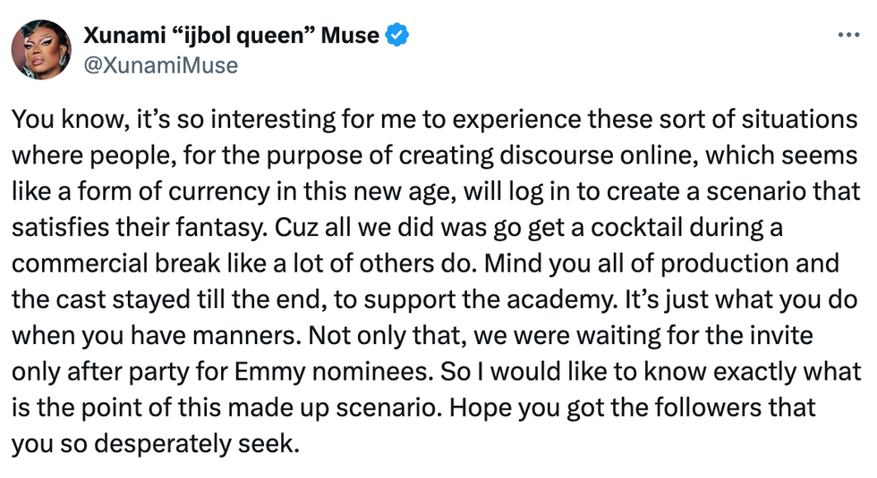 Intentionally or not, Gardner's tweet gives the impression that the Drag Race team walked out of the show in protest, instead of what actually happened—it was a commercial break, when stars frequently mingle, get drinks, and use the restroom.