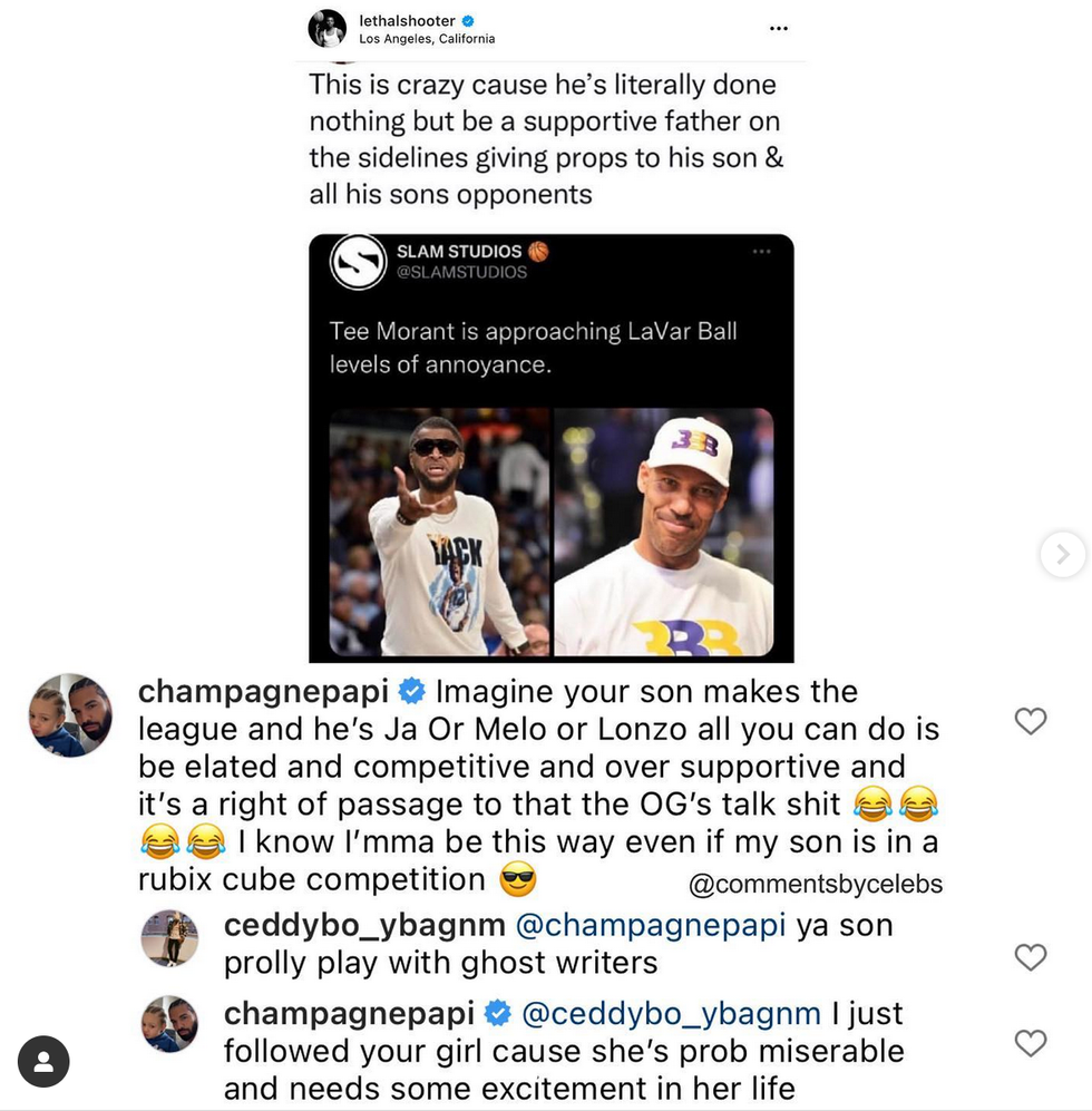 The barb began when the “Certified Lover Boy” rapper–who goes by @champagnepapi–had written on an Instagram post from @lethalshooter about Tee Morant and LaVar Ball.