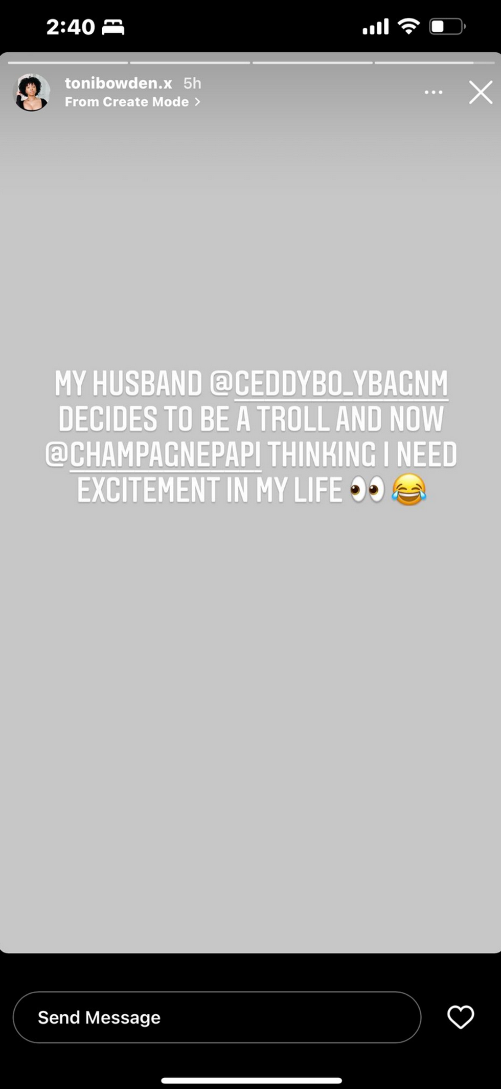 She then wrote, “My husband @ceddybo_ybagnm decides to be a troll and now @champagnepapi thinking I need excitement in my life," followed by laughing and eye emojis.