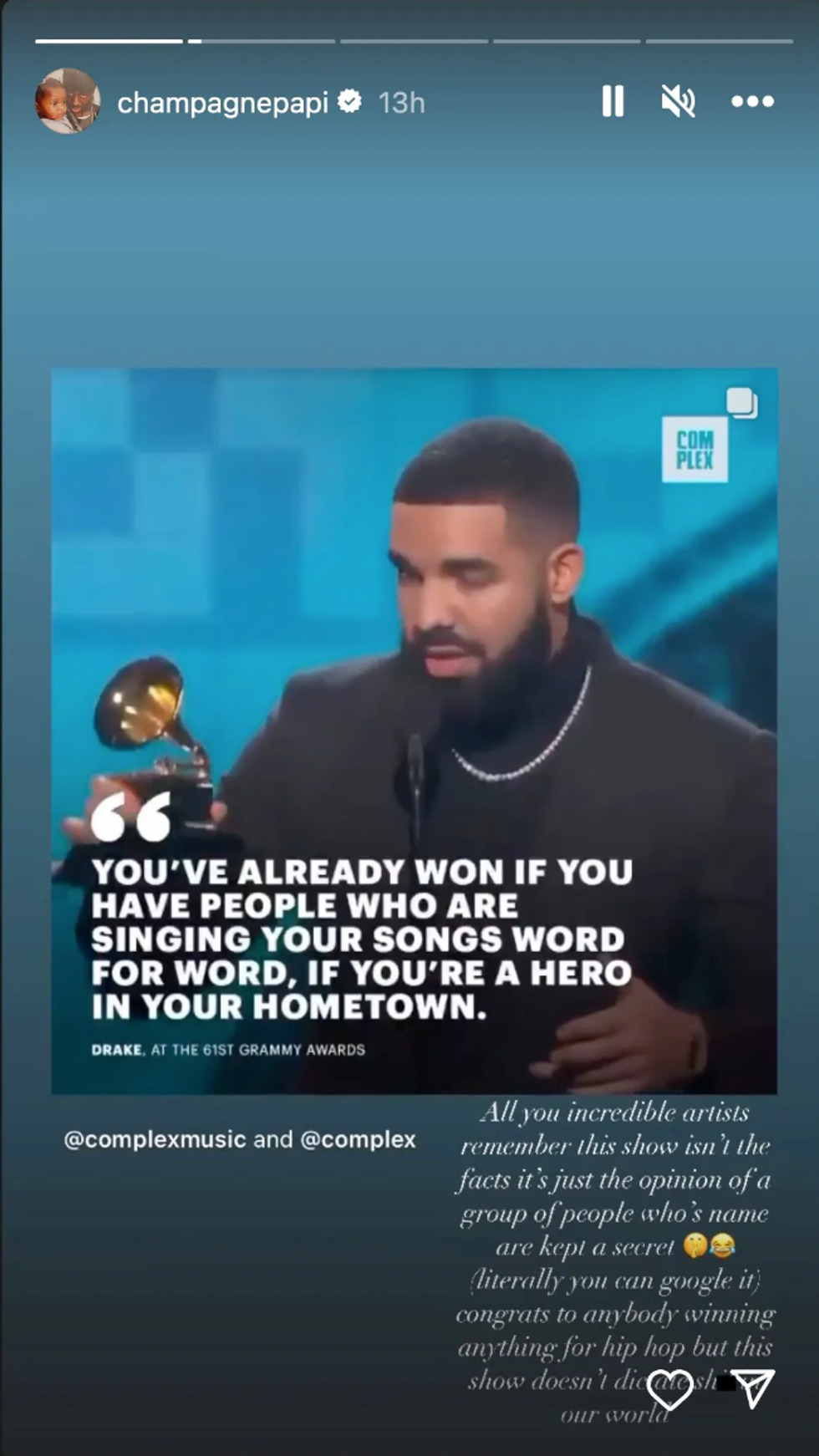 The message overlayed a clip of his 2019 Best Rap Song Grammys acceptance speech for his song “God’s Plan."