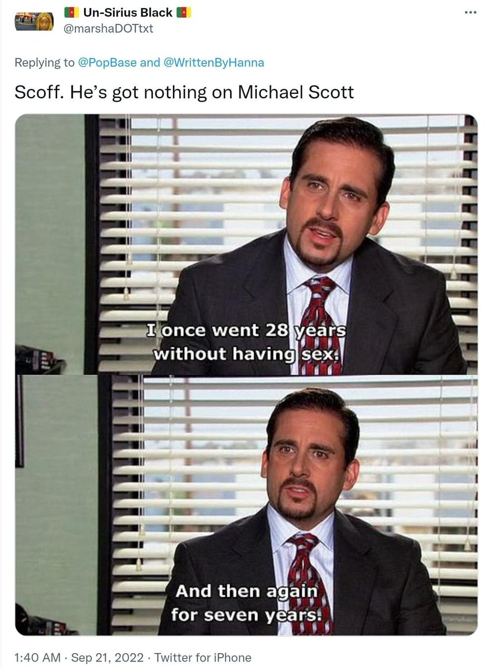 Whether or not we believe six months of abstinence is impressive, we can all agree with Un-Sirius Black who tweeted Michael Scott had Garfield beat.
