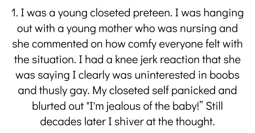 I was a young closeted preteen. I was hanging out with a young mother who was nursing and she commented on how comfy everyone felt with the situation. I had a kneejerk reaction that she was saying I clearly was uninterested in titties and thusly gay. My closeted self panicked and blurted out "I'm jealous of the baby!"
