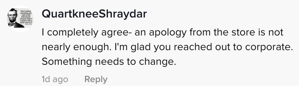 However, the apology she received from the store was not satisfactory, so she reached out to corporate instead and is waiting on an update:"