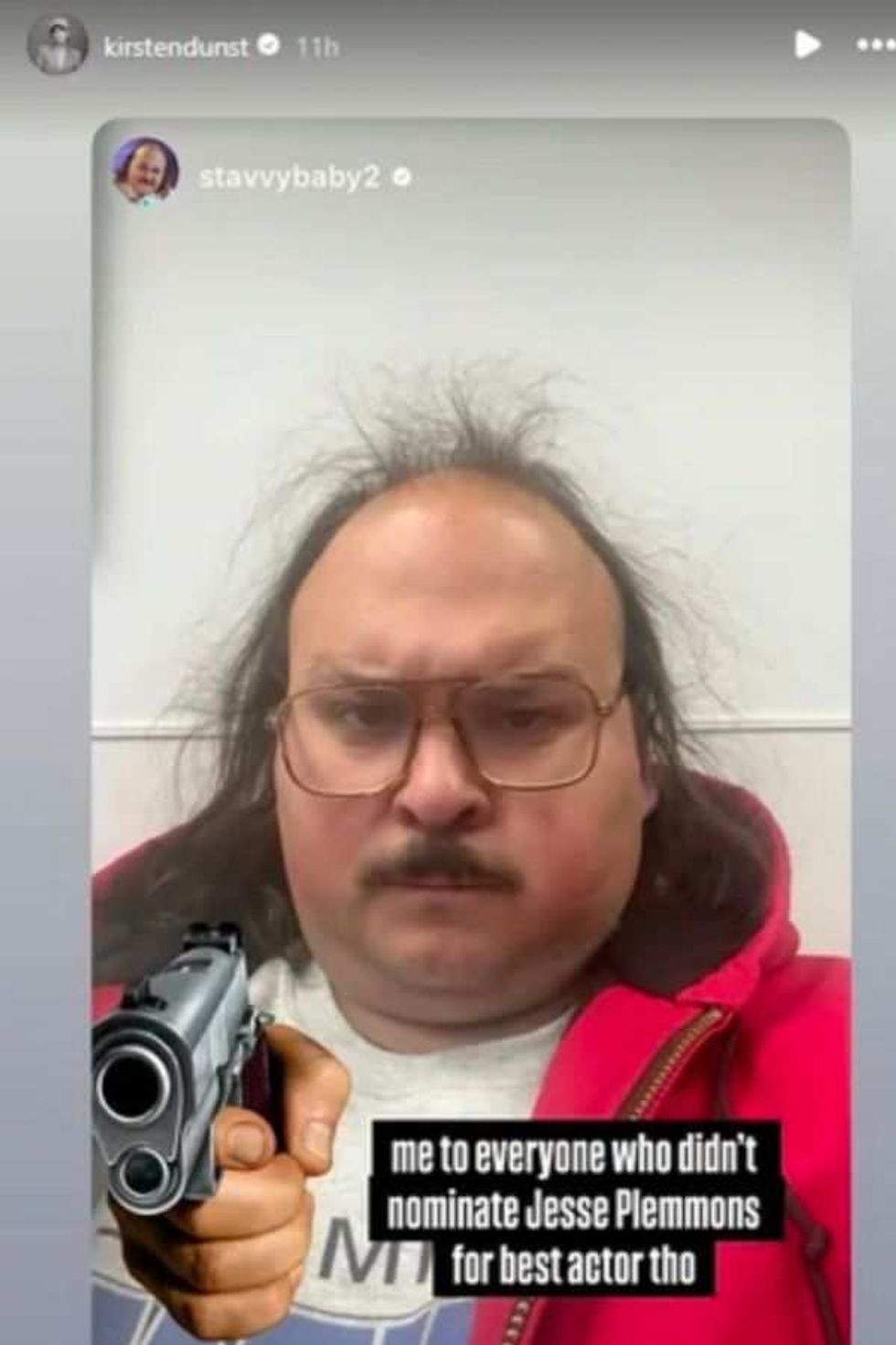 First, the Marie Antoinette star reposted an Instagram Story from comedian and Bugonia castmate Stavros Halkias. In the image, Halkias stares sternly into the camera as a photoshopped hand points a gun at the camera.