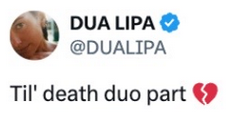 Dua Lipa joined the shenanigans by sharing Duolingo's statement and writing, "Til' death duo part," followed by a broken heart emoji.