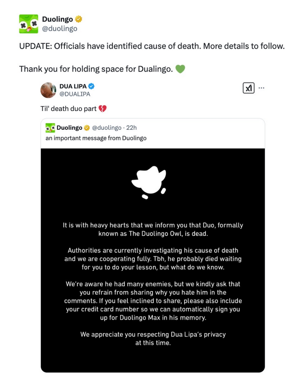 "It is with heavy hearts that we inform you that Duo, formally known as The Duolingo Owl, is dead."