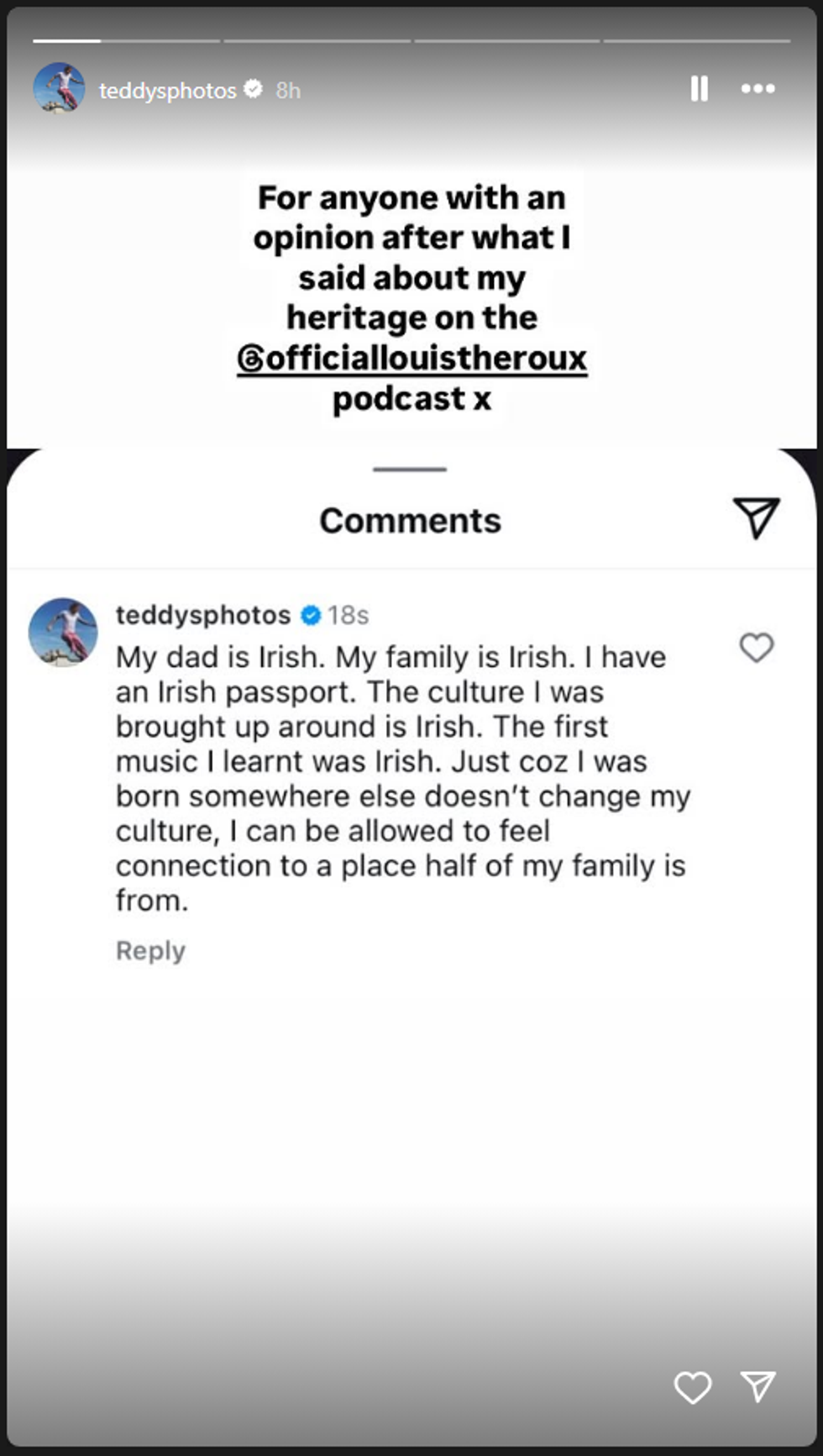 "For anyone with an opinion after what I said about my heritage on the [Louis Theroux Podcast]."