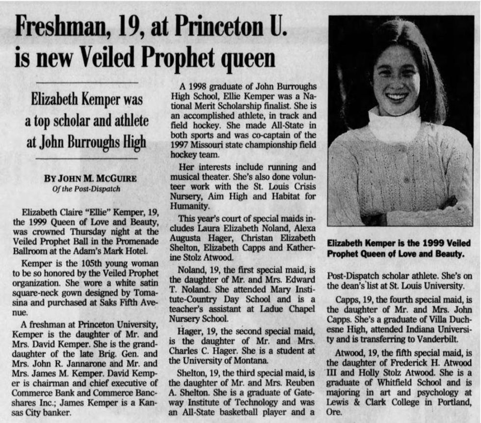 Kemper's apology came after the internet circulated old photographs of an archived news paper article about a young Ellie winning the beauty pageant in 1999. She was dubbed the "Veiled Prophet Queen of Love and Beauty."