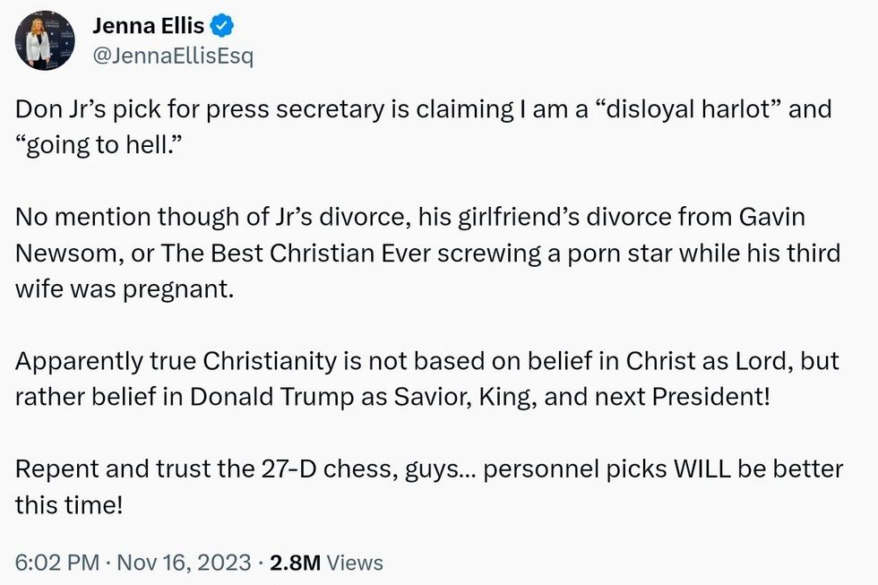 On X, Ellis first took a shot across the bow of Donald Trump Jr. before mockingly referring to his father as "The Best Christian Ever."