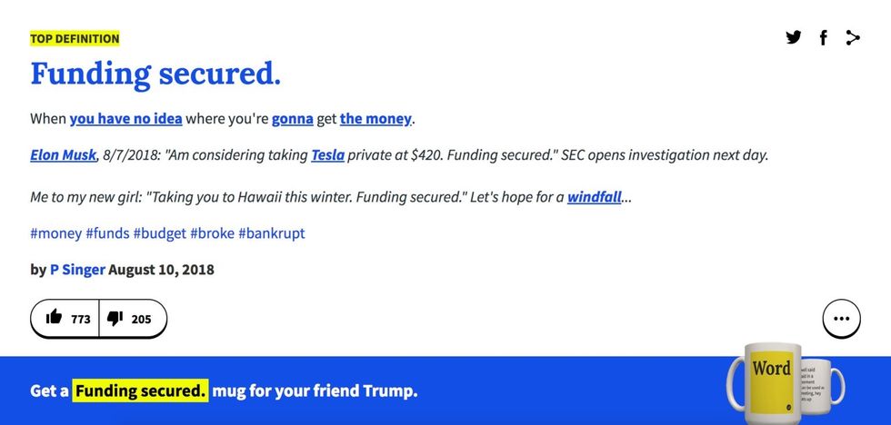 But the good folks at Urban Dictionary weren't the only ones to pile on Musk's over-confident tweet. Twitter's funding was also secured!