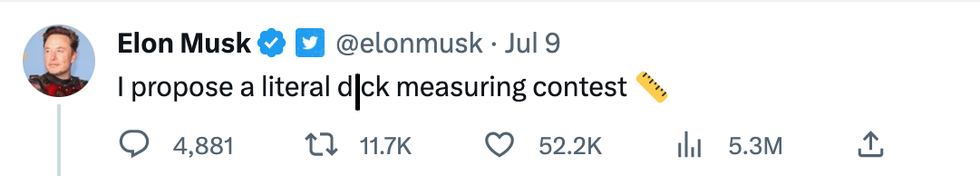 Perhaps Musk was a tad bitter because later that day, he followed up with a tweet challenging Zuckerberg to a "literal d*ck measuring contest."