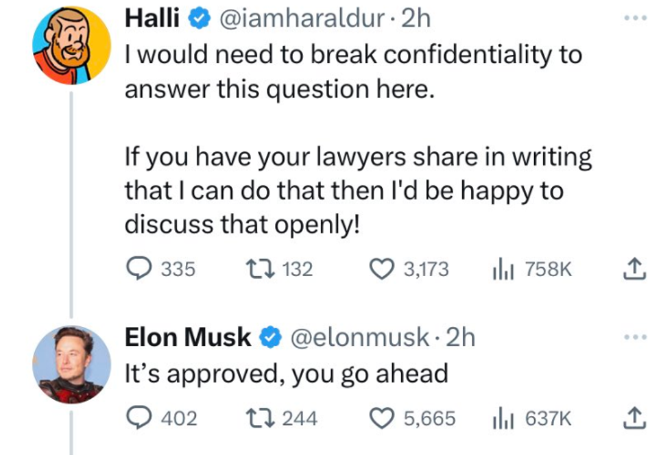 When @iamharaldur expressed he would have to "break confidentiality" to answer his boss' question, Musk gave him the green light, writing: