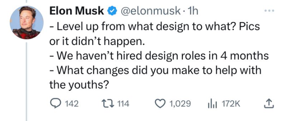 Musk continued to question Halli publicly, asking, "Level up from what design to what?":