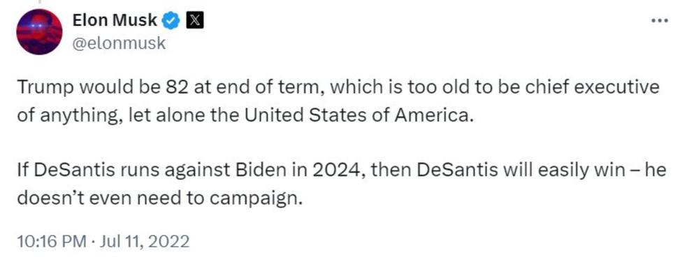 "I agree with @elonmusk. Trump is too old."