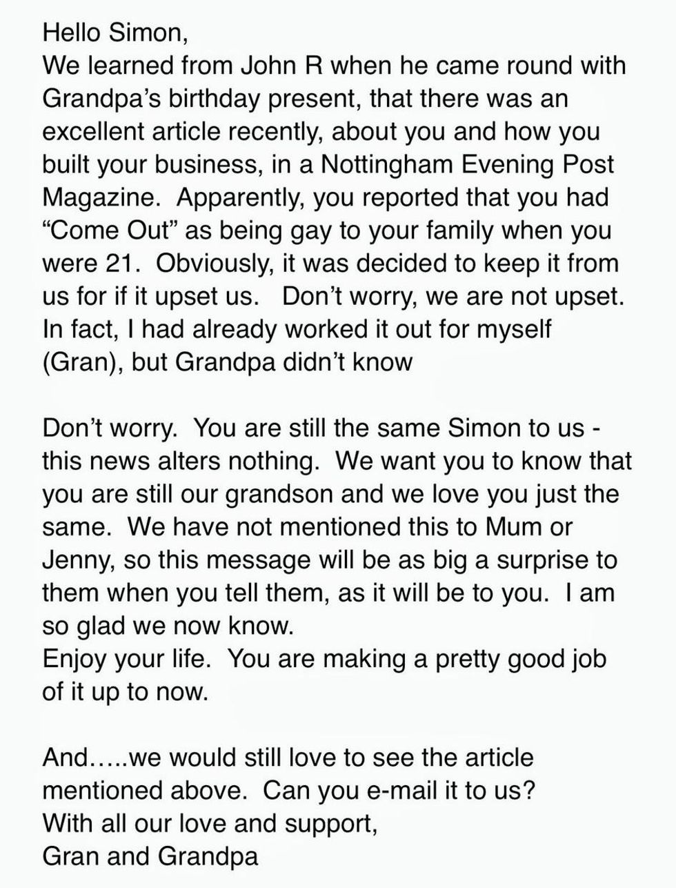 "Don’t worry. You are still the same Simon to us this news alters nothing."