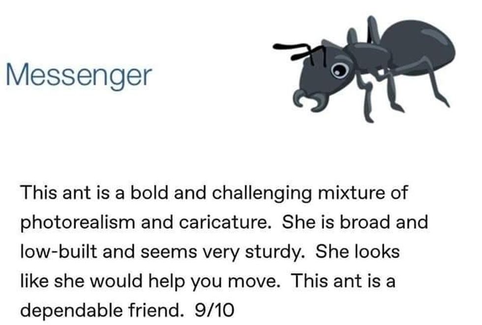 Messenger got high marks—9/10—for their sturdy looking ant who "looks like she would help you move."