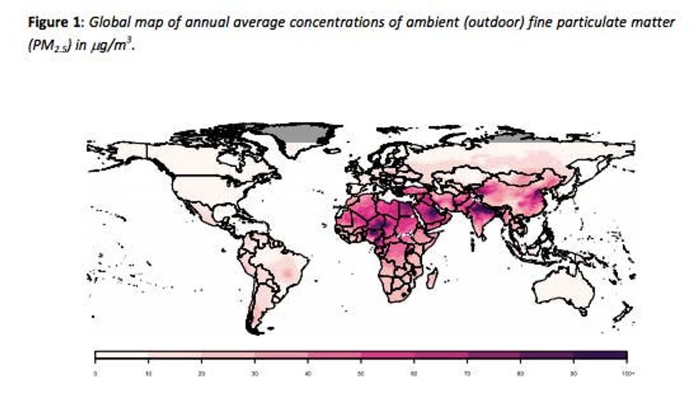 The map is deceptive because it's only measuring the amount of fine particles in the air. These tiny particles in the air create the appearance of haziness, but they aren't always harmful to the environment. For instance, the reason parts of Africa appear to have unclean air on the map is because these are desert areas with large amounts of sand--a fine particle. The map addresses particles like these but not man-made air pollutants like nitrogen oxides and sulfur dioxide--which are released with the burning of coal.