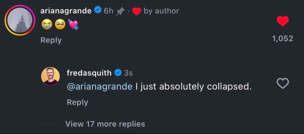 The "Thank U, Next" pop idol responded to Asquith's video with a crying-laugh, teary-eyed, and arrow-through-heart emojis.
