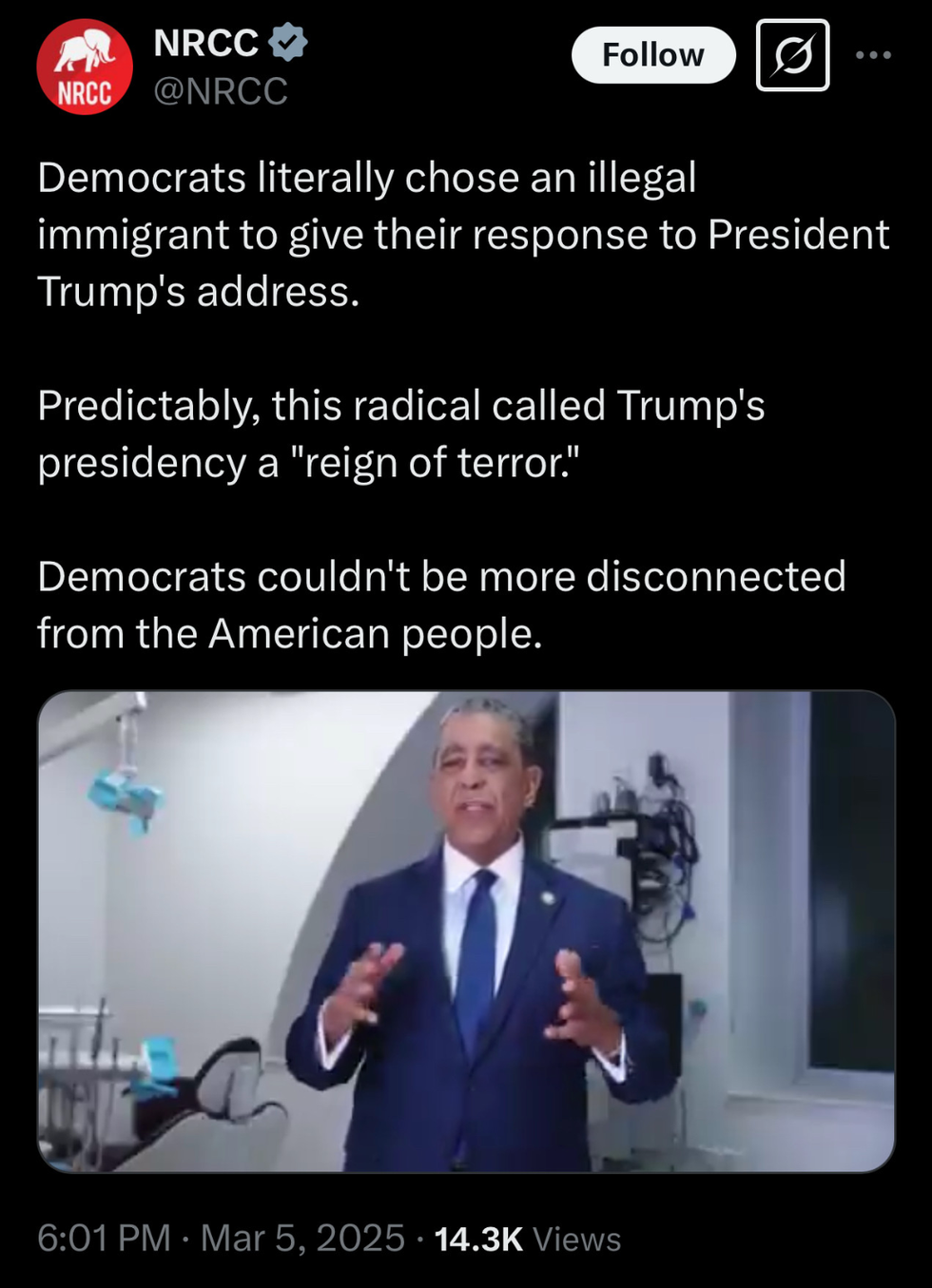 The Spanish-language rebuttal to President Trump's joint address to Congress on Tuesday night placed significant emphasis on Trump's immigration policy. Espaillat specifically criticized a recent executive order establishing English as the national language and efforts to restrict emergency aid.