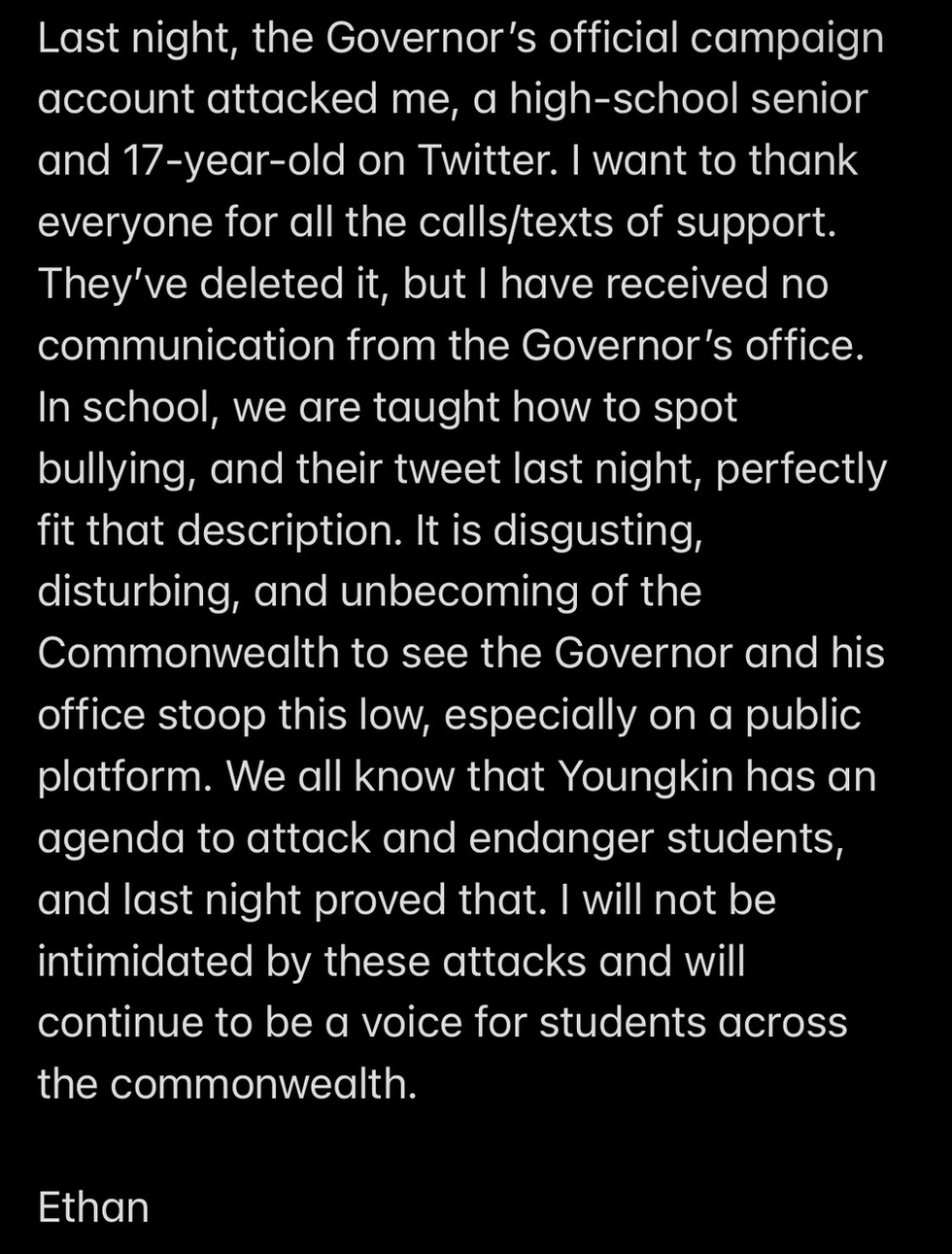 Follow up. Gov. Youngkin\u2019s campaign Twitter bullied Ethan Lynne, 17 yr, because he posted about the disrespectful treatment of the Virginia Governors Mansion researcher that taught about it\u2019s history, including slavery. Virginia chose wrong. #DemVoice1 https://twitter.com/LMerritt1/status/1490101044780703745\u00a0\u2026pic.twitter.com/NbdtAdg74c— Feisty & Fierce (@Feisty & Fierce) 1644181201